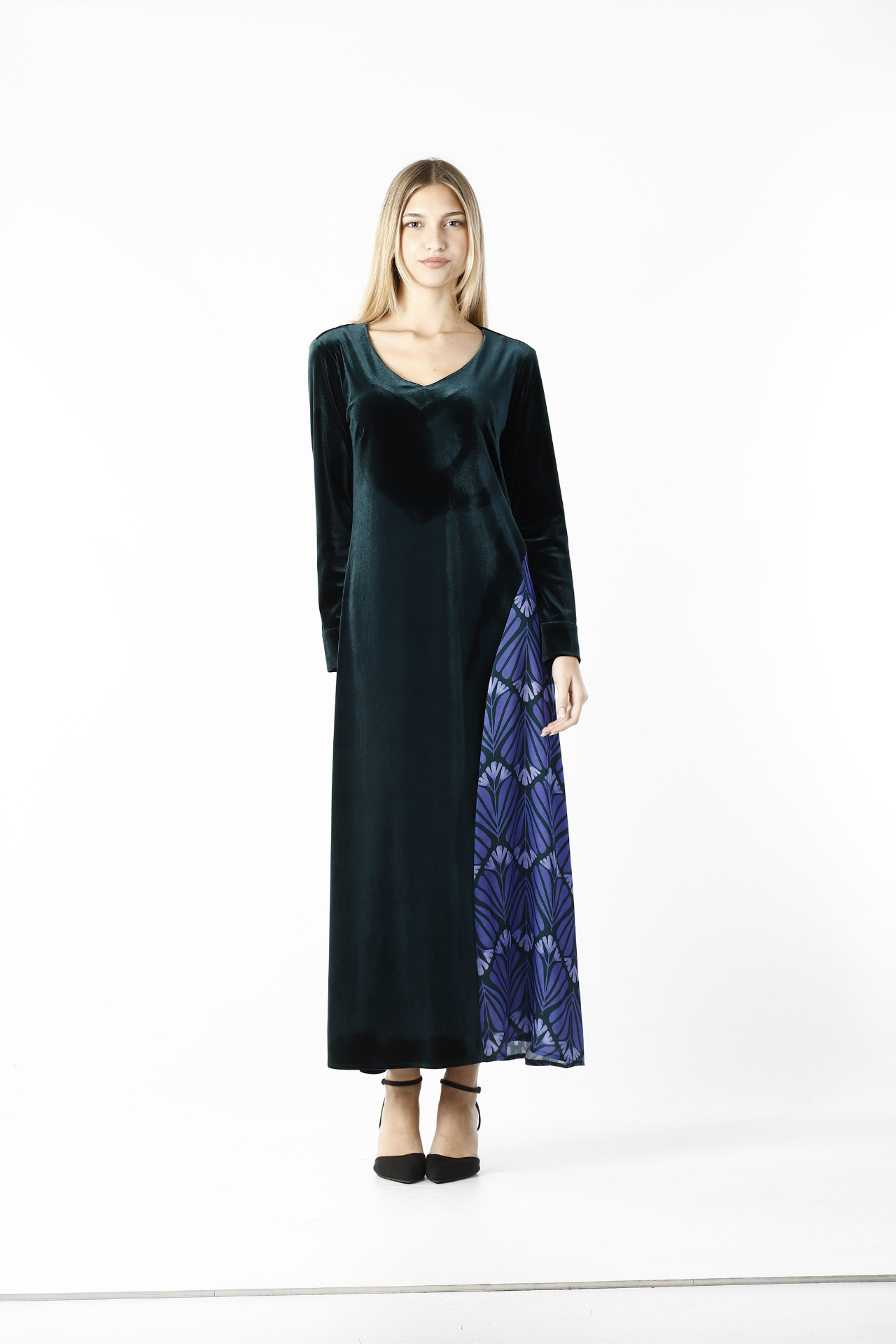 • abito lungo velluto con inserto fantasia